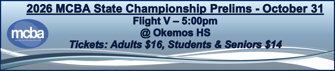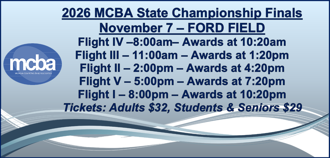 Michigan Competing Band Association 1583 Lake Breeze Ct, Muskegon, MI 49445 mcba.exec.dir@gmail.com |